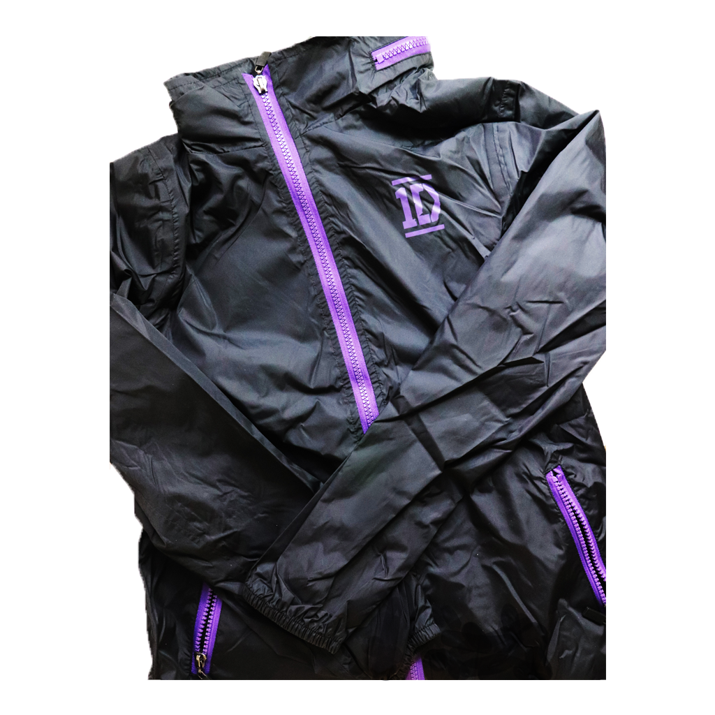 Impermeable color negro con detalles en morado e impresión de 1D.